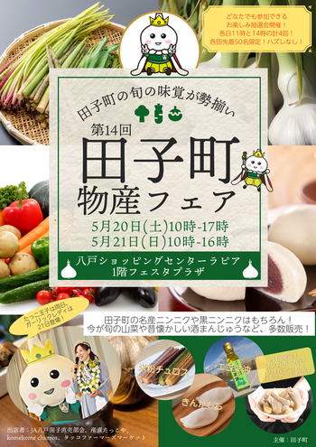 令和7年5月17日(土)に八戸ショッピングセンターラピアにて、「第16回田子町物産フェア」を開催します。田子町で採れた旬の山菜や野菜をはじめ、昔懐かしい「きんかもち」や「酒まんじゅう」など、町内事業者のこだわりの惣菜や加工品など、多数の商品を販売いたします。また当日は第34代ガーリックレディもイベントを盛り上げに来場します。お楽しみ抽選会も行われますので、是非この機会にご来場ください。