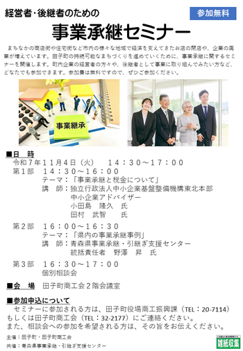 セミナーに参加される方は、田子町役場商工振興課(TEL:20-7114)もしくは田子町商工会(TEL:32-2177)にご連絡ください。