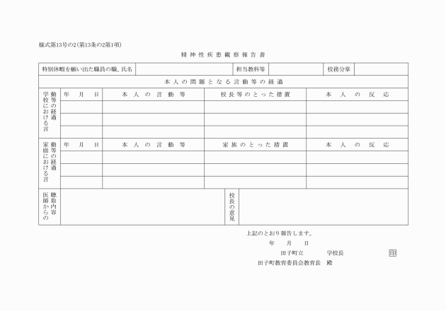 第十三条の二 規則第二十二条の二第一項に定める報告は、精神性疾患観察報告書(様式第十三号の二)によるものとする。