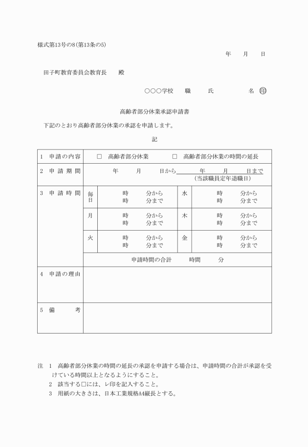 第十三条の五 職員は、地方公務員法第二十六条の三第一項の規定による高齢者部分休業の承認を受けようとするときは、高齢者部分休業承認申請書(様式第十三号の八)により行うものとする。