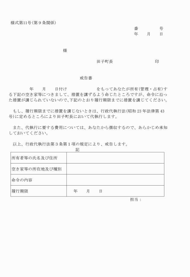 第九条 行政代執行法(昭和二十三年法律第四十三号)第三条第一項の規定による戒告については、戒告書(様式第十一号)によるものとする。