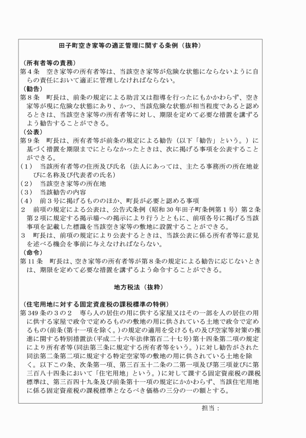 第一条 この規則は、田子町空き家等の適正管理に関する条例(平成二十五年田子町条例第二十一号。以下「条例」という。)第十五条の規定により、条例の施行に関し、必要な事項を定めるものとする。